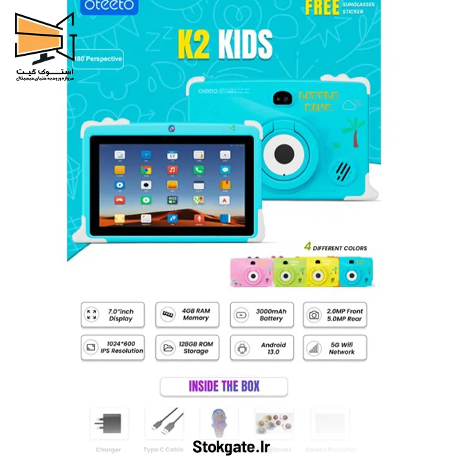 دنیای امن و آموزشی را به کودک خود هدیه دهید! تبلت Oteeto K2 با 128 گیگ حافظه، رم 4 گیگابایتی، و نمایشگر 7 اینچی HD، همراهی ایده‌ آل برای کودکان 3 تا 12 سال است. این تبلت مجهز به سیستم کنترل والدین پیشرفته، اپلیکیشن‌ های آموزشی متنوع و یک قاب ضدضربه بادوام است که خیال شما را از هر بابت راحت میکند. با این تبلت، سرگرمی و یادگیری دست در دست هم پیش میروند. محصول نو و آکبند با تضمین اصالت از استوک گیت