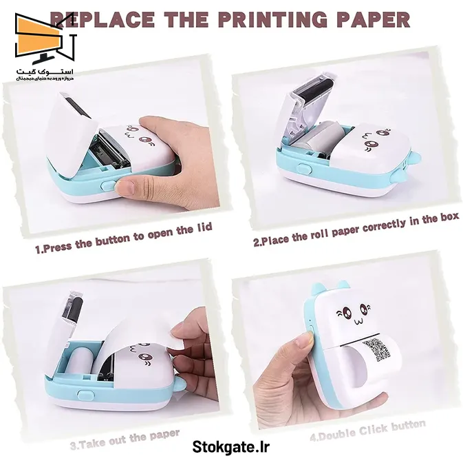 نصب کاغذ: دکمه کنار یا روی دستگاه را فشار دهید تا محفظه باز شود. رول کاغذ را درون آن قرار دهید. نکته حیاتی: مطمئن شوید که سمت براق و صاف کاغذ رو به هد حرارتی (قسمت برش دهنده) باشد، وگرنه چاپ انجام نمیشود.